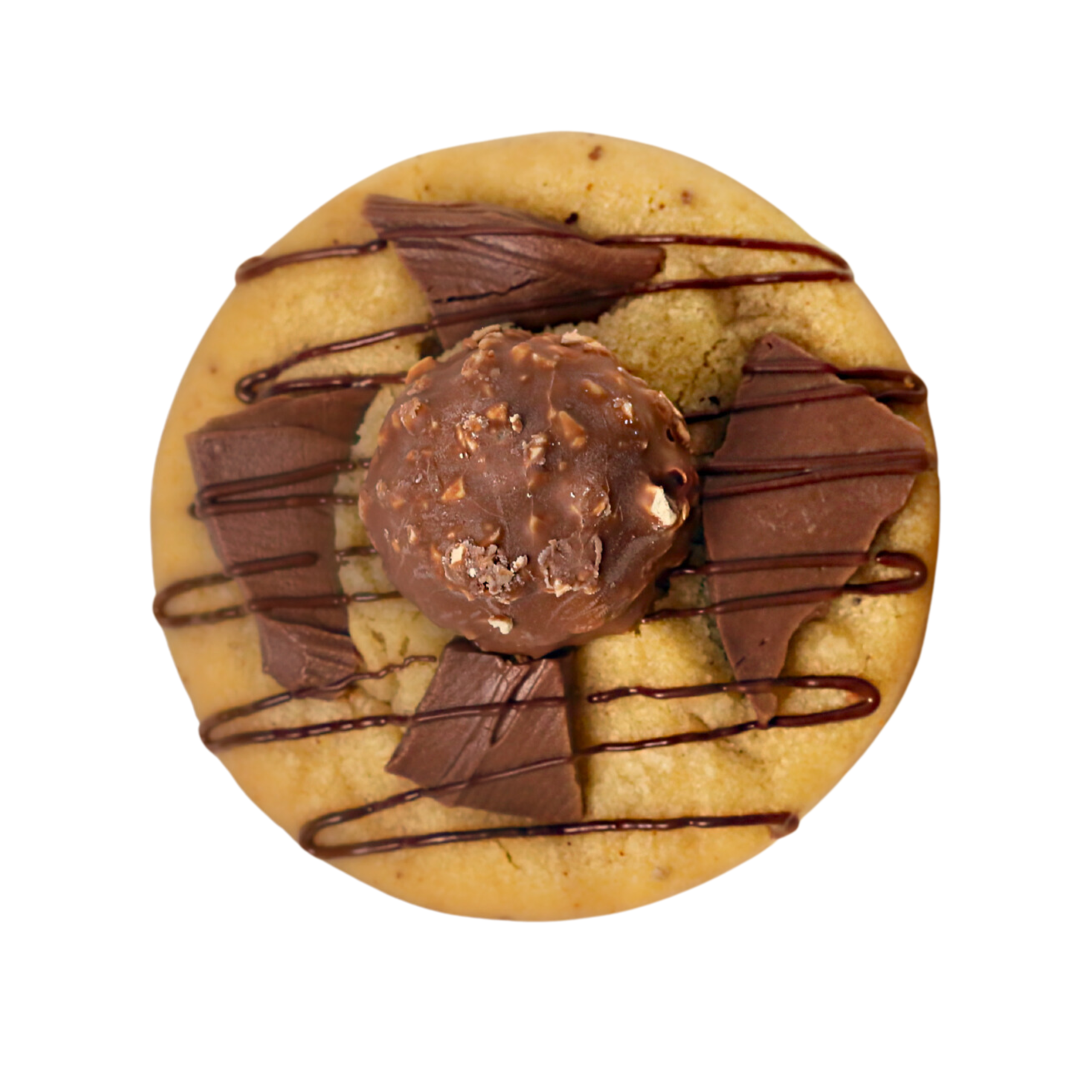 Ingredients: Flour, Butter, Sugar (Brown Sugar, Granulated Sugar), Eggs, Vanilla Extract, Baking Soda, Salt, Nutella, White Chocolate, Milk Chocolate Drizzle, Ferrero Rocher.